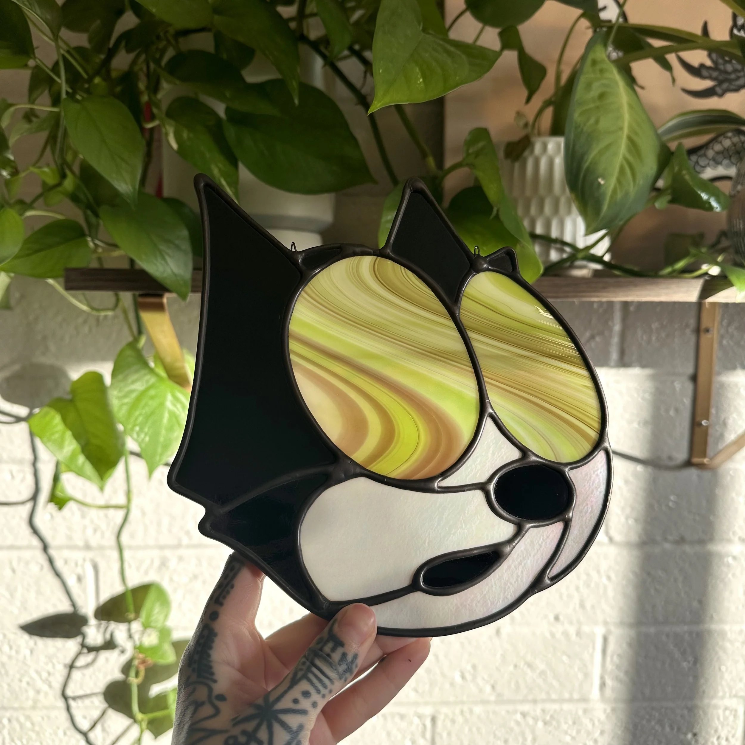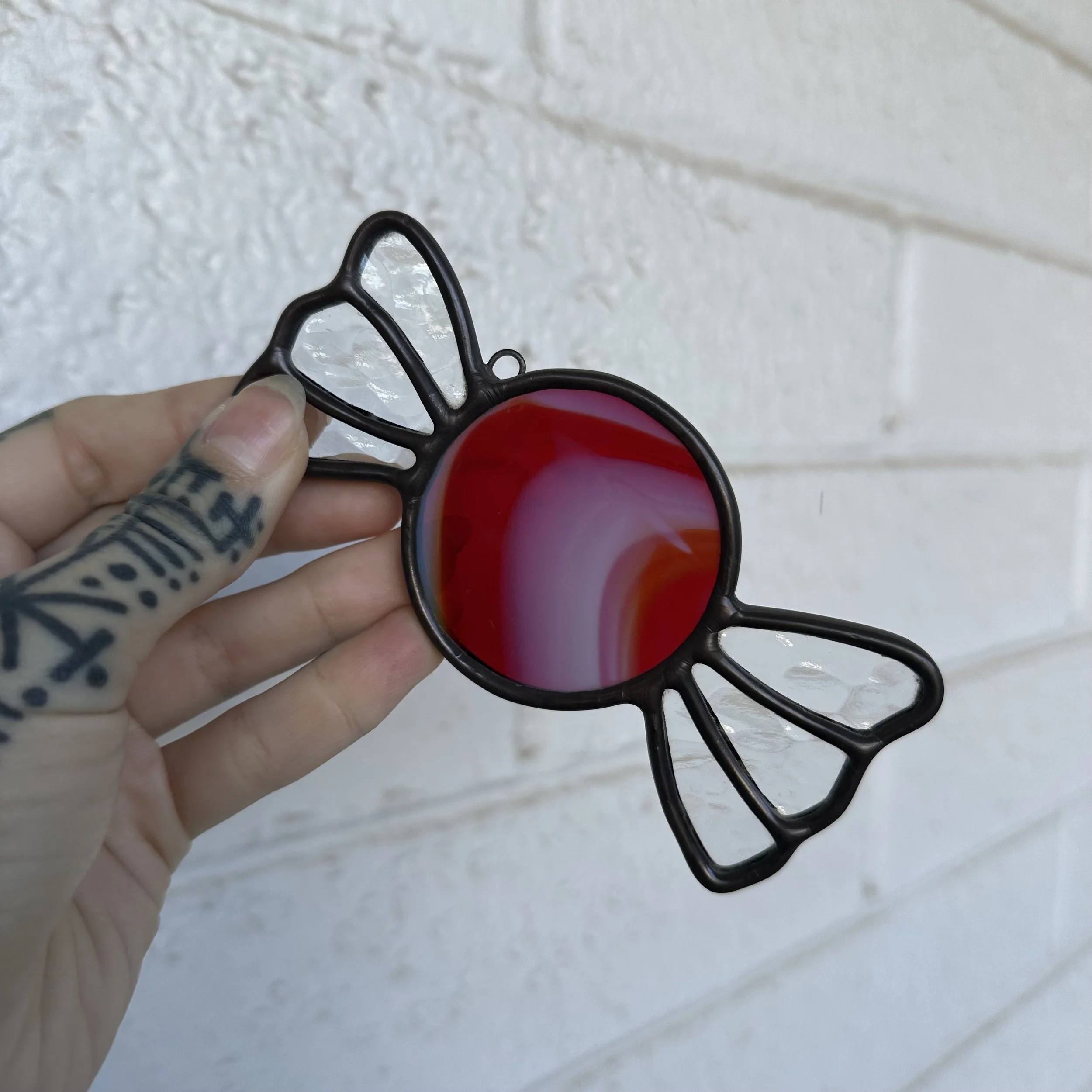 Stained glass butterfly. Will come ready to hang with attached chain. Approximately 12” x 9” at the widest/tallest points.